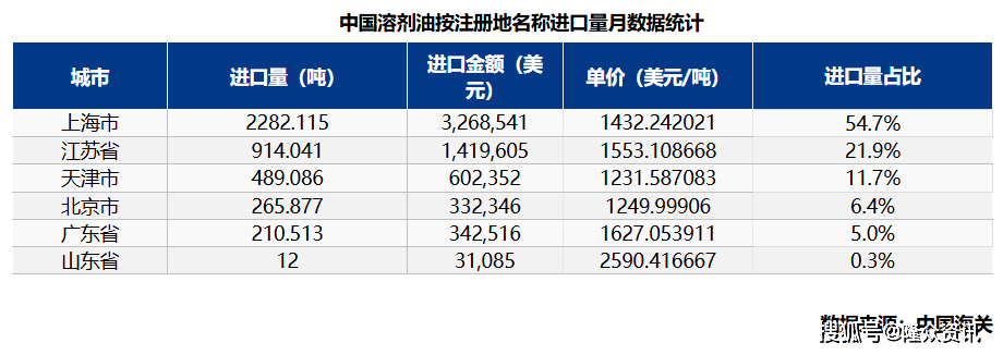 从进口注册地环境看,排名前五位的省市有上海市、江苏省、广东省、天津市和市约占进口总量的97%,上海市是国内溶剂油进口次要注册地,占国内进口总量的55%。